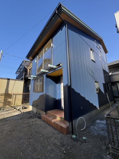 ネイビーのガルバリウム鋼板*を基調に木のナチュラルさを融合させました。