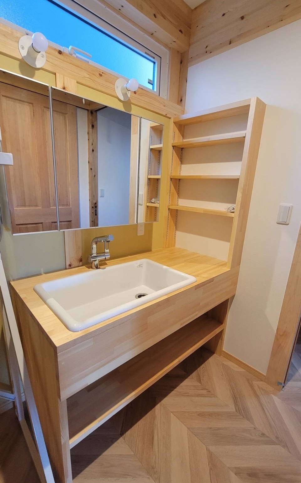 こちらは防水加工をした木の素材で作られた洗面台。とてもおしゃれなのに生活に溶け込んでいる感じが魅力的です。