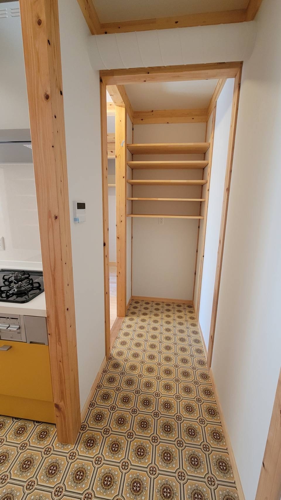 足元にはレトロ風な床、引き出しのカラーにもこだわりが感じられます。